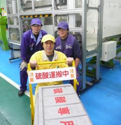特に注意が必要な硫酸の取り扱いですが、取扱者も限定し運搬面の安全を更に強化する為に運搬専用台車を作成し、使用者からも「ヒヤリ・・・ハッ!!」とする事が少なくなったという効果をあげる事ができました。