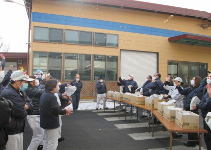 コロナ禍で昨年までは鬼に扮した管理職の方たちに向けて、年男・年女の皆さんに福豆をまいてもらっていましたが、今年は全員参加で豆まき会を行いました!